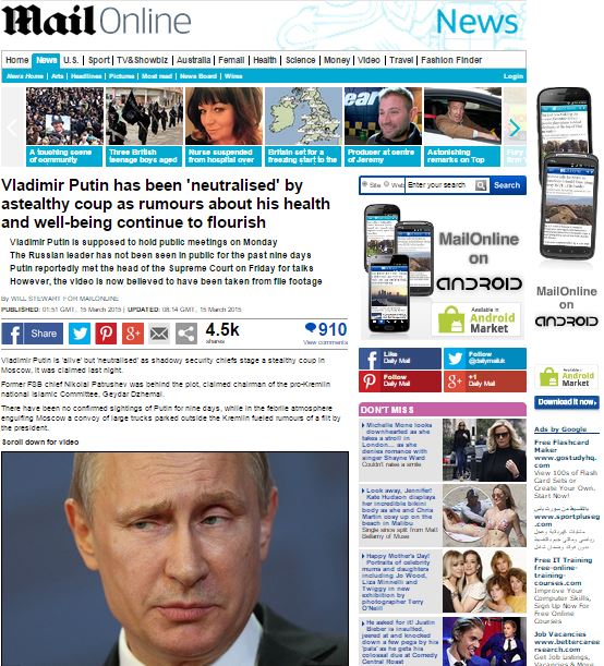 اعلنت جريدة "الديلي ميل" البريطانية اليوم الأحد، عن احتجاز الرئيس الروسي فلاديمير بوتين فى قصر الكرملين مؤكدة ان اختفاء بوتن منذ مايقرب من عشرة أيام يعزز الأقاويل التي تؤكد وجود انقلاب من قيادات عسكرية عليه.