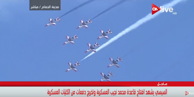 شهد الرئيس عبد الفتاح السيسى والوفود العربية المشاركة بافتتاح قاعدة محمد نجيب العسكرية عرضًا عسكريًا للقوات الجوية، واستعرض الطلاب مهاراتهم الجوية فى العرض، وورسم علم مصر بالدخان تحية للقائد عبد الفتاح السيسى.