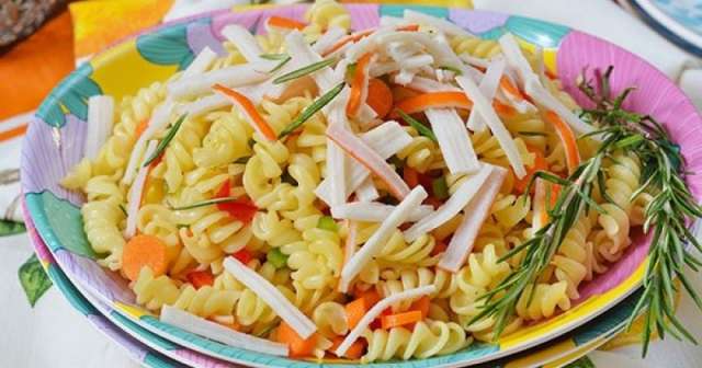ضعي المكرونة المسلوقة في صحن للتقديم وفوقها الخضار المتبل بالصلصة.