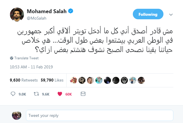 وغرد صلاح منتقدا التراشق المستمر خلال الفترة الماضية بين جماهير الأهلي والزمالك على موقع التواصل الاجتماعي "تويتر"، وقال: "مش قادر أصدق أني كل ما أدخل تويتر ألاقي أكبر جمهورين في الوطن العربي بيشتموا بعض طول الوقت".