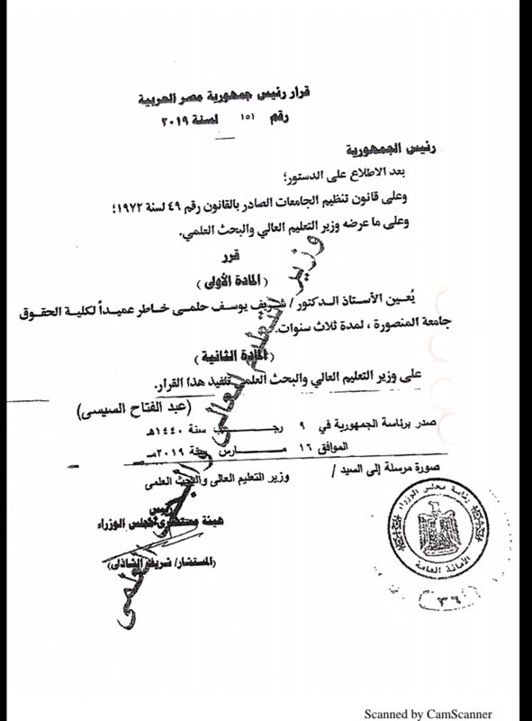 قرار جمهوري بتعيين عميد لكلية الحقوق بجامعة المنصورة