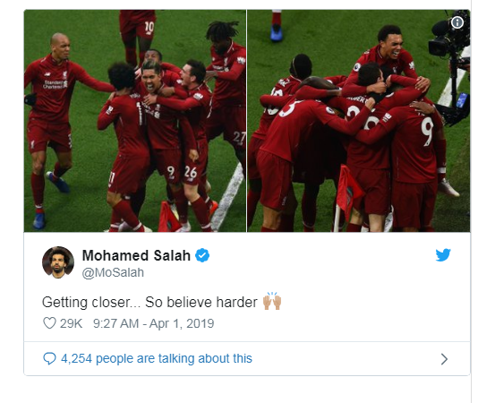 ونشر محمد صلاح عبر حسابه الشخصي "تويتر" صور الاحتفال بالفوز على السبيرز، معلقًا عليها: "يصبح أقرب... لذا آمنوا بقوة".