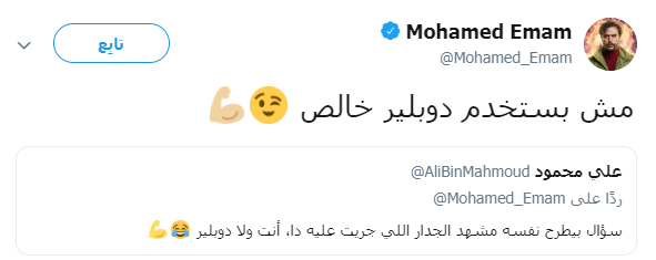 جاء ذلك عندما علق أحد متابعى الفنان محمد إمام عند عرضه أغنية "كسبنا إيه" من مسلسل "هوجان" المقرر عرضه خلال موسم رمضان الدرامى 2019، قائلا: "سؤال بيطرح نفسه.. مشهد الجدار اللى جريت عليه ده أنت ولا دوبلير؟"، ليرد إمام "مش بستخدم دوبلير خالص".