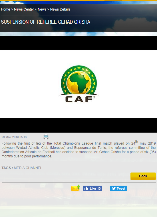 قرر الاتحاد الإفريقي لكرة القدم "كاف" اليوم، إيقاف الحكم المصري جهاد جريشة 6 أشهر، بسبب سوء إدارته لمباراة الوداد المغربي وضيفه الترجي التونسي في ذهاب نهائي دوري أبطال إفريقيا.