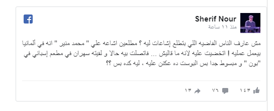 وقال نور: "مش عارف الناس الفاضية اللي بتطلع إشاعات ليه؟ مطلعين إشاعة على محمد منير إنه في ألمانيا بيعمل عملية! اتخضيت عليه لأنه ما قاليش.. فاتصلت بيه حالا ولقيته سهران في مطعم إسباني في "بون" ومبسوط جدا بس البوست ده عكنن عليا، ليه كده بس؟؟".