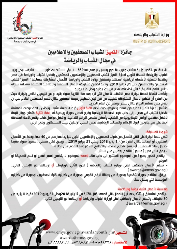 تستقبل وزارة الشباب والرياضة الأعمال المشاركة بمسابقة "التميز" لشباب الصحفيين والإعلاميين حتى 31 يوليو 2019، وذلك لضمان مشاركة الأعمال الصحفية والإعلامية المهتمة بتغطية بطولة كأس الأمم الأفريقية التى تحتضنها مصر من 21 يونيو وحتى 19 يوليو.