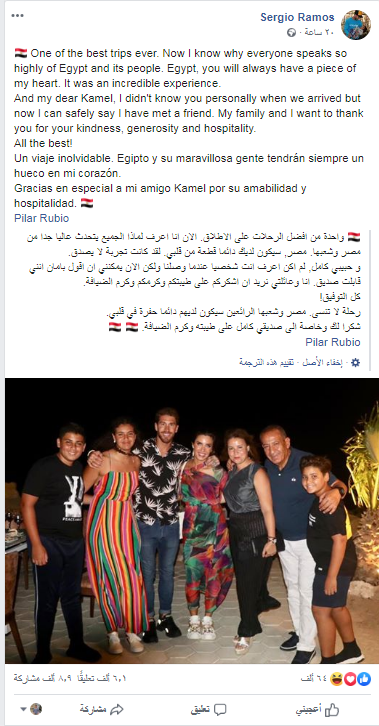وبعد تلك الواقعة، هاجمت الجماهير المصرية المدافع الدولي الإسباني، وأطلقت عليه مجموعة من الأوصاف "المسيئة" و"المهينة"، لكن على ما يبدو، فقد وجد راموس أخيرا فرصة لخطف ود المصريين، وطي صفحة واقعة "إصابته لصلاح"، من خلال نشره تدوينة عبر حسابه في "فيسبوك" عقب نهاية إجازته الصيفية في الغردقة، عبر فيها عن شكره وسعادته بزيارة بلد "الفراعنة".