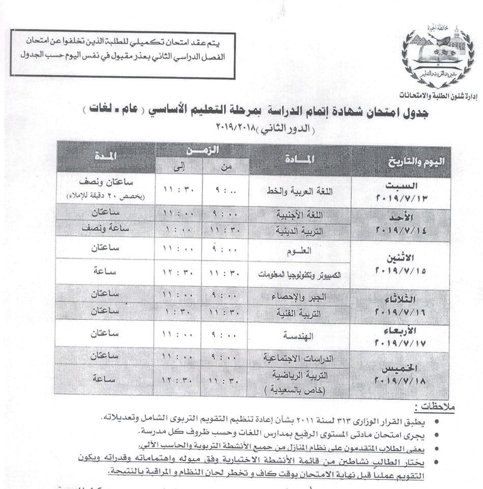 تبدأ طلاب الشهادة الإعدادية بمحافظة الجيزة، في التاسعة من صباح السبت 13 يوليو، امتحانات الدور الثاني في مادتي اللغة العربية والخط.