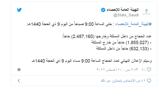 أعلنت الهيئة العامة للإحصاء في المملكة العربية السعودية، أن عدد الحجاج تجاوز 2.4 مليون شخص، من الداخل والخارج، بينهم أكثر من 600 ألف من حجاج الداخل.