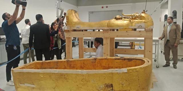 توجه الدكتور خالد العناني وزير الآثار، إلى معمل الترميم بالمتحف المصري الكبير لتفقد أعمال تعقيم وترميم تابوت الملك توت عنخ آمون، وذلك بعد خروجه من خيمة التعقيم الخاصة به للبدء في أعمال ترميمه.