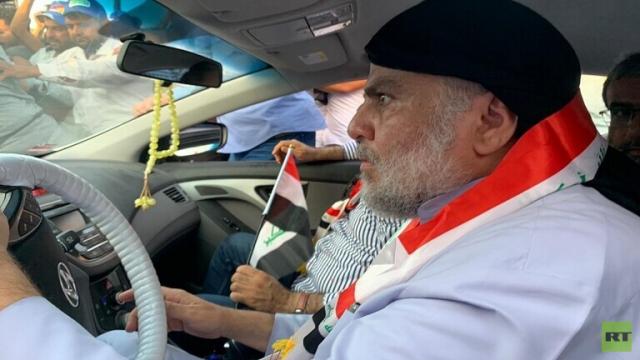 ظهر زعيم التيار الصدري في العراق، مقتدى الصدر، وهو يقود سيارة صغيرة بين جموع المتظاهرين في مدينة النجف.