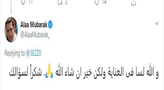 حيث أعلن نجل الرئيس الأسبق حسني مبارك علاء عبر تدوينة نشرها على صفحته الرسمية على موقع التواصل الإجتماعي تويتر، أن حالة والدته الصحية مستقرة، على الرغم من أنها لا تزال تحت العناية المركزة بأمر الأطباء، حيث رد على متابعة سألته عن الحالة الصحية لوالدته، قائلاً أنها لازالت في العناية ولكن خير ان شاء الله وشكراً لسؤالك.