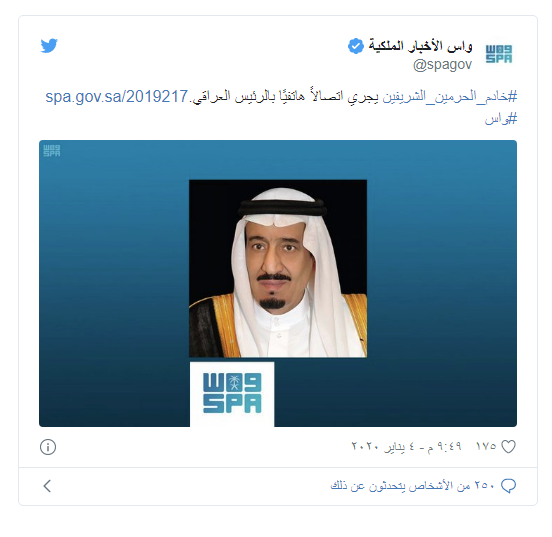 يأتي ذلك، بعد ساعات من إجراء العاهل السعودي الملك سلمان بن عبدالعزيز، اتصالا هاتفيا بالرئيس العراقي برهم صالح، رئيس جمهورية العراق، دعاه فيها للتهدئة ونزع فتيل الأزمة.