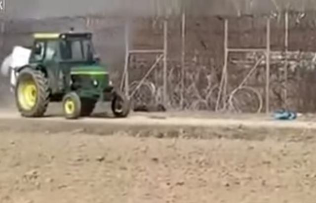 استخدم المزارع جراره من أجل إبعاد المهاجرين الذين تجمعوا بالقرب من الحاجز الحدودي مع تركيا، حيث قام بالتجوال على طول الشريط بجراره ليرش المهاجرين بسائل كان قد وضعه في خزان خلفه.