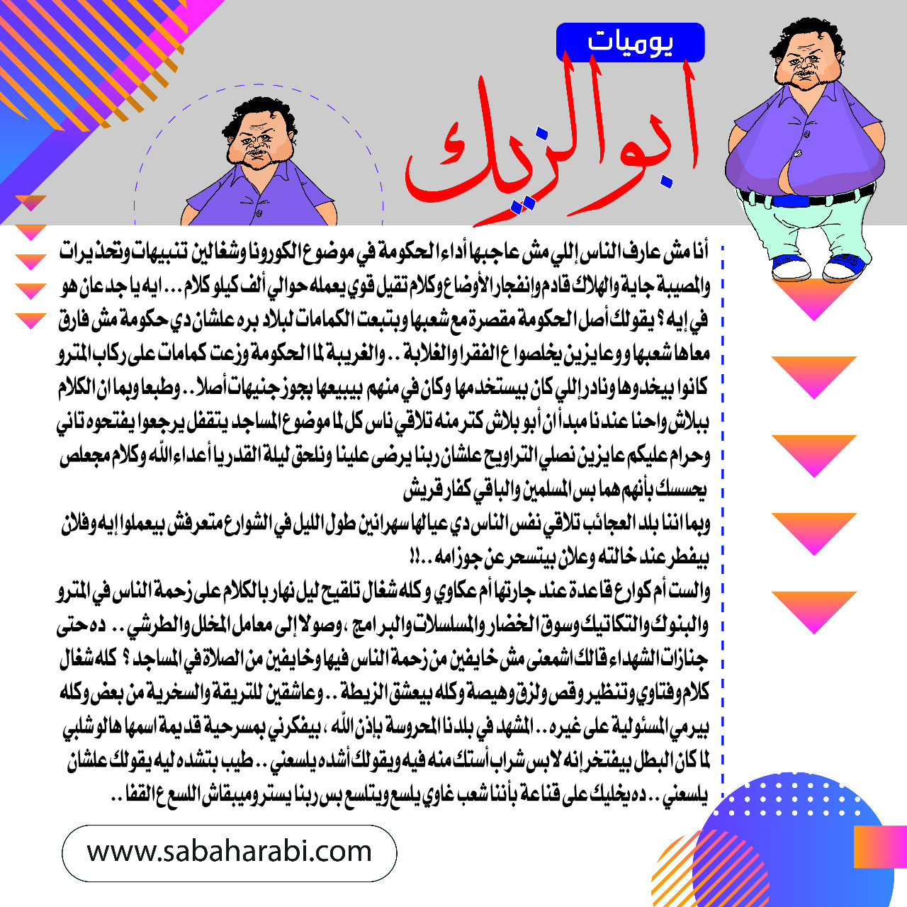 والست أم كوارع قاعدة عند جارتها أم عكاوي و كله شغال تلقيح ليل نهار بالكلام على زحمة الناس في المترو والبنوك والتكاتيك وسوق الخضار والمسلسلات والبرامج ، وصولا إلى معامل المخلل والطرشي .. ده حتى جنازات الشهداء قالك اشمعنى مش خايفين من زحمة الناس فيها وخايفين من الصلاة في المساجد ؟ كله شغال كلام وفتاوي وتنظير وقص ولزق وهيصة وكله بيعشق الزيطة .. وعاشقين للتريقة والسخرية من بعض وكله بيرمي المسئولية على غيره .. المشهد في بلدنا المحروسة بإذن الله ، بيفكرني بمسرحية قديمة اسمها هالو شلبي ، لما كان البطل بيفتخر إنه لابس شراب أستك منه فيه ويقولك أشده يلسعني .. طيب بتشده ليه يقولك علشان يلسعني .. ده يخليك على قناعة بأننا شعب غاوي يلسع ويتلسع بس ربنا يستر وميبقاش اللسع ع القفا ..
