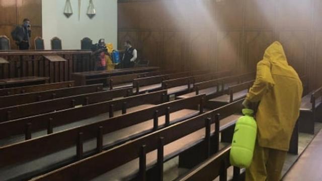 وعقم عدد من العاملين، منصات القضاء بقاعات المحاكم المختلفة، والتي يعتليها القضاة، لنظر القضايا المستعجلة، ويقف بجانبها المتقاضين، باستخدام مطهرات لتعقيم المكان، وللحفاظ على تطهير القاعات وأركان المجلس من الأمراض والأوبئة المنتشرة.