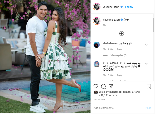 وتأتي الصورة التي شاركتها ياسمين صبري اليوم ردا على صورة شاركها أحمد أبو هشيمة لهما من نفس جلسة التصوير عبر حسابه على "إنستجرام"، أمس الجمعة، والتي علق عليها بقلبين.