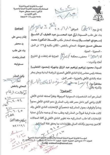 أرسل تركي آل الشيخ رئيس الهيئة العامة للترفيه في السعودية، ومالك نادي ألميريا الإسباني، إنذارا على يد مُحضر إلى نادي الأهلي المصري، لرد التبرعات التي منحها للنادي ومجلس الإدارة.