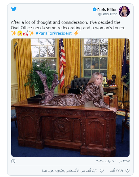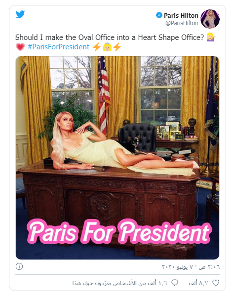 ونشرت هيلتون، وهي وريثة محتملة لشبكة الفنادق "هيلتون"، على حسابها في "تويتر" سلسلة صور منتجة باستخدام برنامج "فوتوشوب" تظهرها وهي ترقد على المكتب الرئاسي في المكتب البيضاوي في البيت الأبيض، وذلك تحت عنوان "باريس رئيسة!".