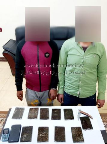 تمكنت وحدة مباحث مركز شرطة ساقلته بمديرية أمن سوهاج عقب تحريات مسبقة وإتخاذ الإجراءات القانونية من ضبط (عدد 10 طرب لمخدر الحشيش - سلاح أبيض - عدد 2 هاتف محمول ) بحوزة (شخصين - لأحدهما معلومات جنائية ) وذلك حال ترددهما على دائرة المركز للإتجار فـى المواد المخدرة .. وبمواجهتهما إعترفا بنشاطمها الإجرامى وحيازتهما للمضبوطات بقصد الإتجار والسلاح الأبيض لإستخدامه فى تقطيع المواد المخدرة والهواتف المحمولة للإتصال بعملائهما .
