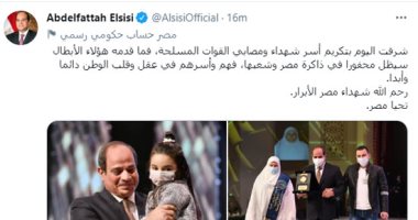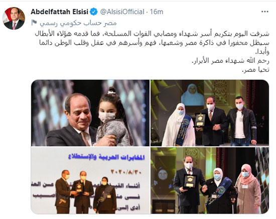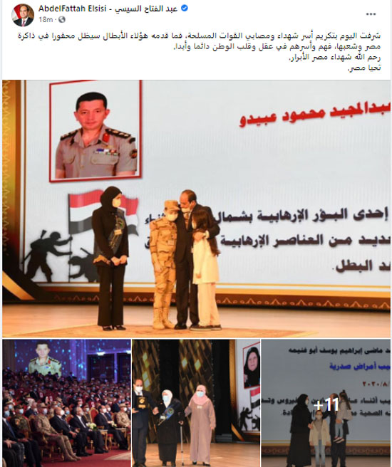 قال الرئيس عبد الفتاح السيسى:" شرفت اليوم بتكريم أسر شهداء ومصابي القوات المسلحة، فما قدمه هؤلاء الأبطال سيظل محفورا فى ذاكرة مصر وشعبها، فهم وأسرهم في عقل وقلب الوطن دائما وأبدا.