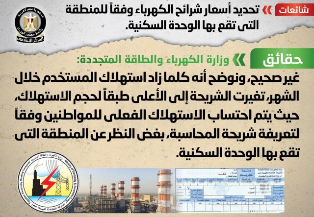 تداولت بعض المواقع الإلكترونية وصفحات التواصل الاجتماعي أنباء بشأن تحديد أسعار شرائح الكهرباء وفقاً للمنطقة التي تقع بها الوحدة السكنية، وقد قام المركز الإعلامي لمجلس الوزراء بالتواصل مع وزارة الكهرباء والطاقة المتجددة، والتي نفت تلك الأنباء، مُؤكدةً أنه لا صحة لتحديد أسعار شرائح الكهرباء وفقاً للمنطقة التي تقع بها الوحدة السكنية، موضحةً أنه كلما زاد استهلاك المستخدم خلال الشهر، تغيرت الشريحة إلى الأعلى طبقاً لحجم الاستهلاك، حيث يتم احتساب الاستهلاك الفعلي للمواطنين وفقاً لتعريفة شريحة المحاسبة بغض النظر عن المنطقة التي تقع بها الوحدة السكنية.