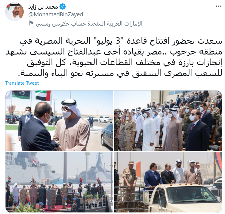 وقال ولى عهد أبو ظبى، فى تغريدة عبر حسابه الرسمى على موقع التواصل الاجتماعى "تويتر"، "سعدت بحضور افتتاح قاعدة 3 يوليو البحرية المصرية في منطقة جرجوب.. مصر بقيادة أخي عبد الفتاح السيسي تشهد إنجازات بارزة في مختلف القطاعات الحيوية، كل التوفيق للشعب المصري الشقيق في مسيرته نحو البناء والتنمية".