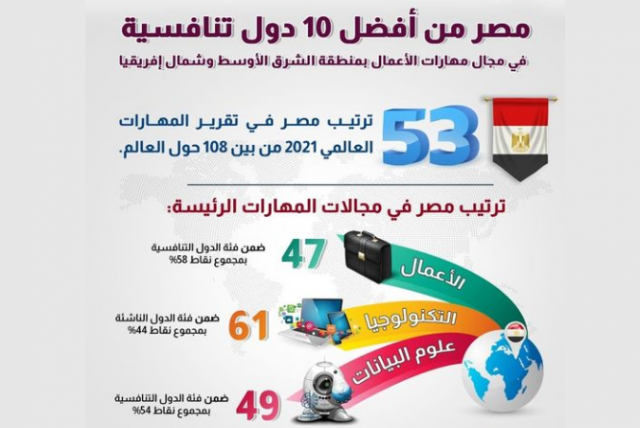 رصد مركز المعلومات ودعم اتخاذ القرار تحسن وضع مصر في تقرير المهارات العالمي الصادر عن مؤسسة كورسيرا في يونيو 2021؛ حيث جاءت فيه مصر ضمن أفضل 10 دول تنافسية في الشرق الأوسط وشمال إفريقيا وفي الترتيب الـ 47 من بين 108 دولة عالميًّا في مجال مهارات الأعمال.