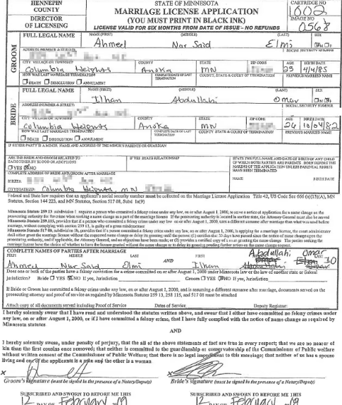 وأثيرت شائعات زواج إلهان عمر من شقيقها قبل أكثر من سنة، إذ أفادت تقارير إعلامية بأن مكتب التحقيقات الفيدرالي أجرى جلسات استماع لعمر خلال تحقيقات يجريها للتثبت من أن زوجها الثاني أحمد علمي هو في الأصل شقيقها.