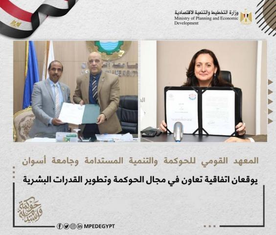 وقع المعهد القومي للحوكمة والتنمية المستدامة الذراع التدريبي لوزارة التخطيط والتنمية الاقتصادية اتفاقية تعاون مع جامعة أسوان في مجالات الحوكمة والتطوير الإداري ودعم بناء وتطوير القدرات البشرية والدراسات البحثية والفاعليات العلمية. قام بتوقيع الإتفاقية الدكتورة شريفة شريف المدير التنفيذي للمعهد القومي للحوكمة والتنمية المستدامة والأستاذ الدكتور أيمن محمود عثمان القائم بأعمال رئيس جامعة أسوان.