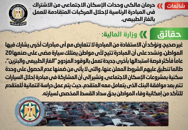 انتشر في بعض المواقع الإلكترونية وصفحات التواصل الاجتماعي أنباء بشأن حرمان مالكي وحدات الإسكان الاجتماعي من الاشتراك في المبادرة الرئاسية لإحلال المركبات المتقادمة للعمل بالغاز الطبيعي، وقد قام المركز الإعلامي لمجلس الوزراء بالتواصل مع وزارة المالية، والتي نفت تلك الأنباء، مُؤكدةً أنه لا صحة لحرمان مالكي وحدات الإسكان الاجتماعي الاستفادة من المبادرة الرئاسية لإحلال المركبات المتقادمة للعمل بالغاز الطبيعي، وأن الاستفادة من المبادرة لا تتعارض مع أي مبادرات أخرى يشارك فيها المواطن، مُشددةً على أن المبادرة تتيح لأي مواطن يمتلك سيارة مضى على صنعها 20 عاماً فأكثر فرصة استبدالها بأخرى جديدة تعمل بالوقود المزدوج "الغاز الطبيعي والبنزين"، طالما تنطبق عليهم الشروط المعلن عنها، والتي لا يأتي من ضمنها عدم الحصول على وحدة سكنية بمشروعات الإسكان الاجتماعي، مُشيرةً إلى أن المشاركة في مبادرة إحلال السيارات تتم بعد موافقة البنك الذي يتعامل معه المتقدم، حيث يتم عمل دراسة ائتمانية للمتقدم للتأكد من إمكانية وفاء المواطن بحق سداد القسط المخصص لسيارته.