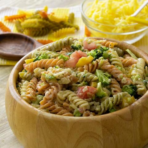 نضع الباستا في صحن ثم نضيف لها الخضراوات والجبن ونقلب جيداً حتى يمتزجوا تماماً.