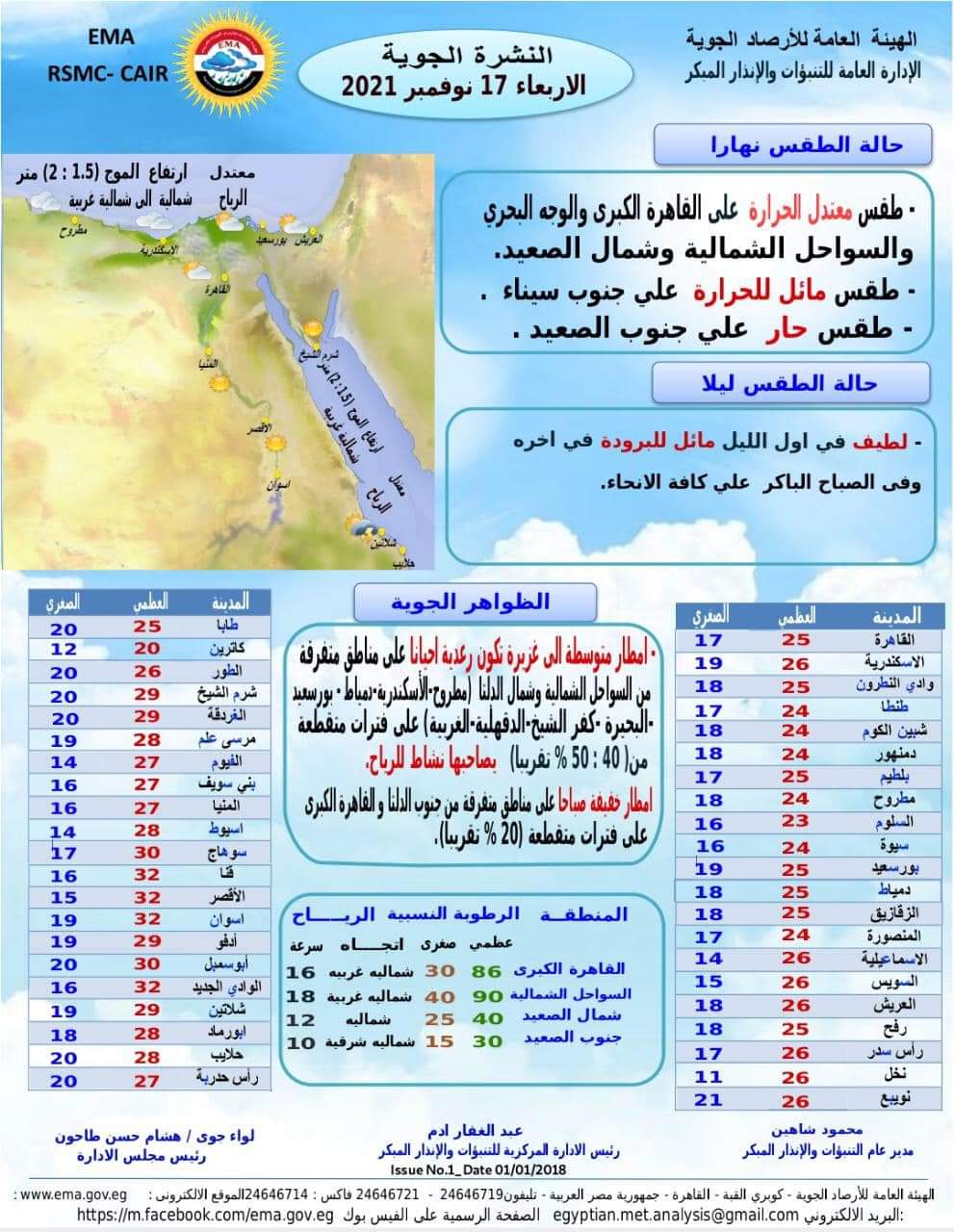 وأشارت الهيئة إلى اعتدال حالة البحر الأحمر، وتكون الأمواج مرتفعة بقيم تتراوح ما بين 1.5 إلى 2 متر فوق مسطح البحر الأحمر، بينما تنشط رياح فوقه تكون اتجاهها شمالية غربية.