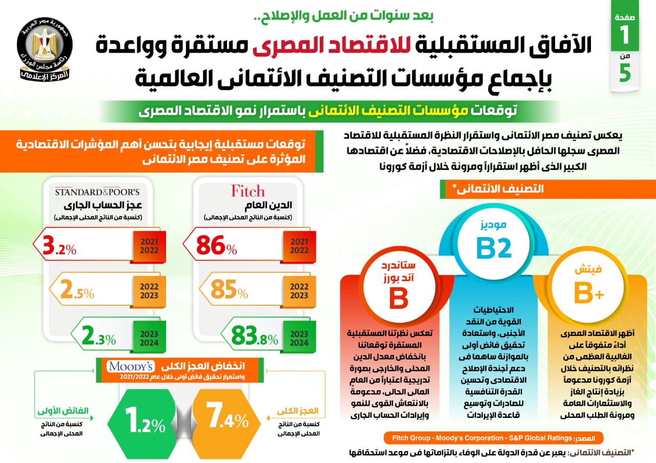 كما جاء قرار مؤسسة «ستاندرد آند بورز» بتثبيت التصنيف الائتماني لمصر بالعملتين المحلية والأجنبية كما هو دون تعديل عند مستوى B مع الإبقاء على النظرة المستقبلية المستقرة للاقتصاد المصريStable Outlook للمرة الرابعة علي التوالي منذ بدء جائحة كورونا، بمثابة ثقة إضافية في صلابة وتنوع الاقتصاد المصري؛ ويعكس استمرار تجديد ثقة المؤسسات الدولية في الاقتصاد المصري والتزام الحكومة بمسار مستدام للإصلاح الاقتصادي، فقد أشادت مؤسسة «ستاندرد أند بورز» في تقريرها الأخير بقوة ومرونة وتوازن إطار السياسات الذي وضعته الحكومة للتعامل مع تداعيات الجائحة، مع استكمال تنفيذ الإصلاحات الاقتصادية والمالية والهيكلية؛ مما ساعد في توفير قاعدة تمويل محلية قوية ومتنوعة في مصر، وارتفاع رصيد الاحتياطي من النقد الأجنبي، على نحو يؤدى إلى تحسين القدرة التنافسية للصادرات، وتوسيع قاعدة الإيرادات، وهو ما يؤكد قوة وتنوع الاقتصاد المصري.