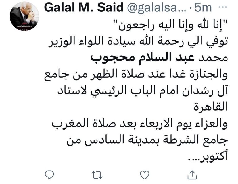توفى إلى رحمة الله سيادة اللواء الوزير محمد عبد السلام المحجوب، والجنازة غدًا عند صلاة الظهر، من مسجد آل رشدان، أمام الباب الرئيسى لاستاد القاهرة"، والعزاء يوم الأربعاء بعد صلاة المغرب، بمسجد الشرطة بمدينة 6 أكتوبر".