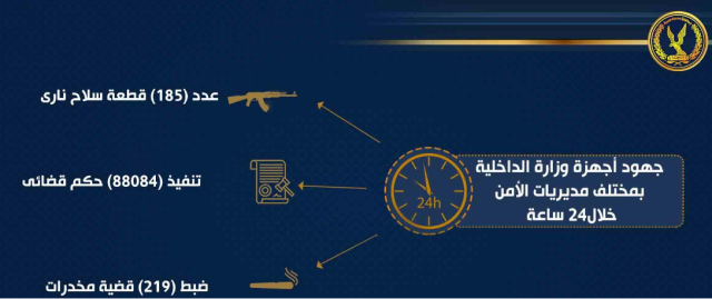 قامت أجهزة وزارة الداخلية بمختلف مديريات الأمن على مستوى الجمهورية بتوجيه حملة أمنية مكبرة أسفرت جهودها خلال24 ساعة عن تحقيق النتائج الإيجابية التالية:-