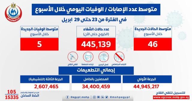 يذكر أن عدد الحاصلين على اللقاحات المضادة لفيروس كورونا بلغ 34 مليونًا و 400 ألف و 459 من المحصنين بالكامل حتى الآن، وتناشد الوزارة، المواطنين بالتسجيل على الموقع الإلكتروني للوزارة https://egcovac.mohp.gov.eg/#/registration لتلقي لقاحات فيروس كورونا، والتي تساهم في حماية كافة أفراد الأسرة من الإصابات الشديدة بفيروس كورونا ومتحوراته، مؤكدة أن الدولة المصرية لا تدخر جهدًا في توفير اللقاحات للمواطنين بالمجان، وذلك في إطار حرص الوزارة على الصحة العامة للمواطنين وعلى مكتسبات الدولة في التصدي للجائحة.