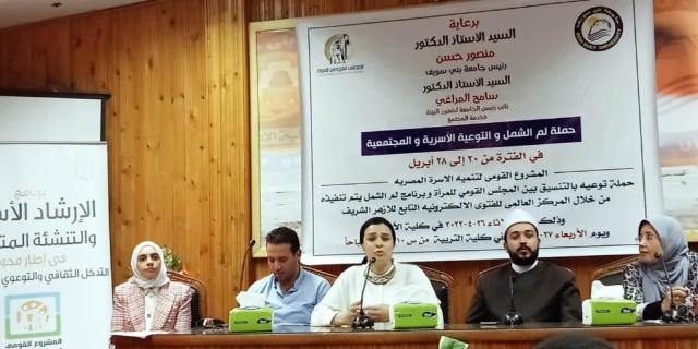 فى إطار المشروع القومي لتنمية الأسرة المصرية الذى أطلقه السيد الرئيس عبد الفتاح السيسي رئيس الجمهورية، عقد المجلس القوميللمرأة بالتعاون مع مركز الأزهر العالمي للفتوى من خلال وحدة لم الشمل وبرنامج التوعية الأسرية والمجتمعية حملة توعوية ضمن برنامجالارشاد الاسري والتنشئة المتوازنه ، وذلك بمحافظة بنى سويف في الفترة من ٢٤ الي ٢٨ ابريل ٢٠٢٢ ، تضمنت الحملة ندوات / لقاءاتجماهيرية.