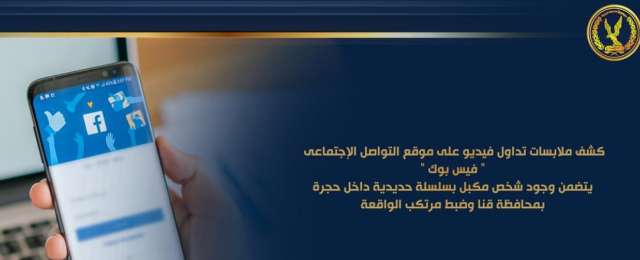 فى إطار جهود الاجهزة الأمنية لكشف ملابسات تداول مقطع فيديو على أحد الحسابات الشخصية على موقع التواصل الإجتماعى"فيس بوك" متضمناً وجود أحد الأشخاص مكبل اليدين والساقين بسلسلة حديدية داخل إحدى الحجرات بدائرة مركز شرطة نجع حمادى بقنا .