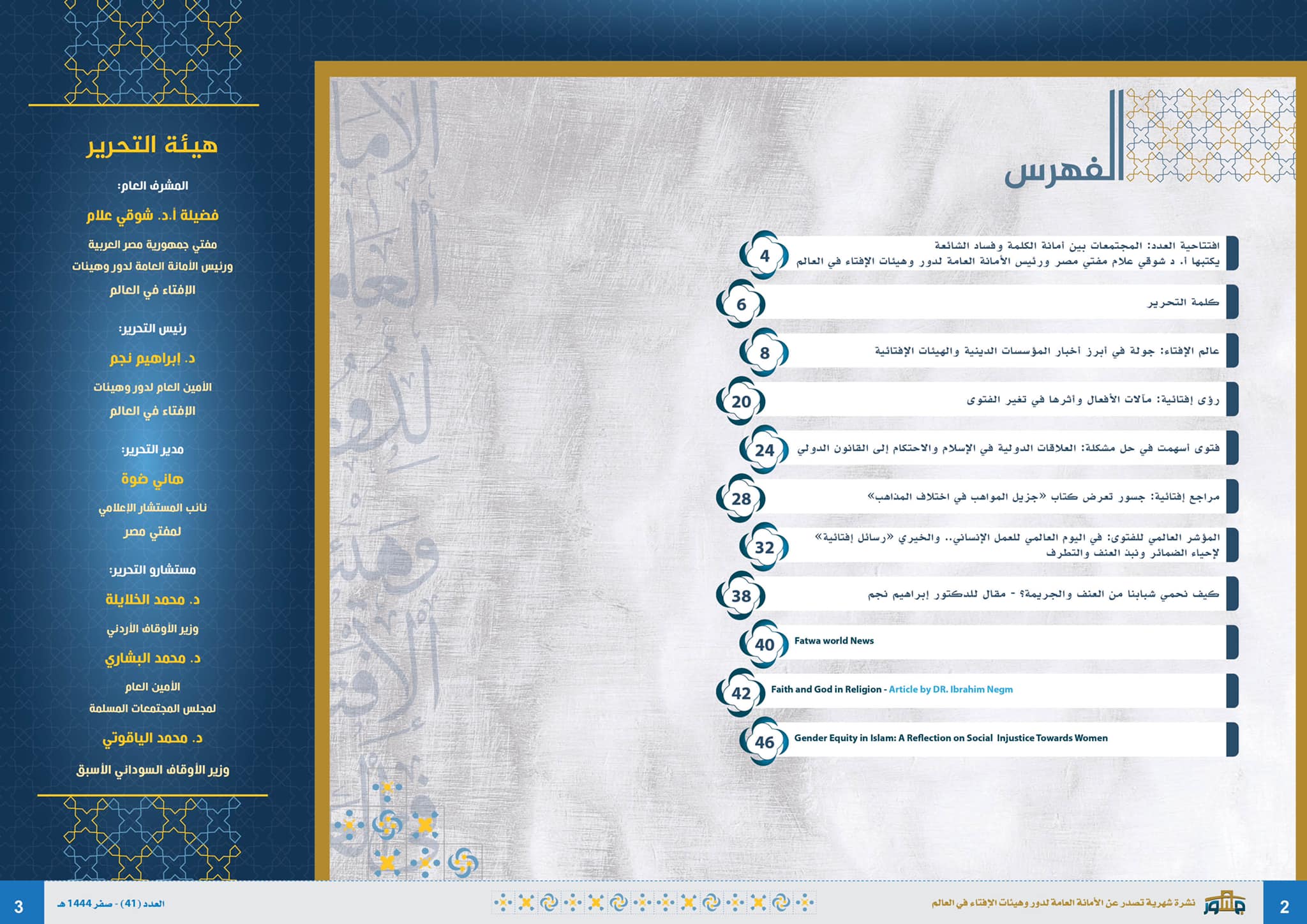 كما يطوف العدد على المشهد الإفتائي والإسلامي بجولة إخبارية في باب عالم الإفتاء.