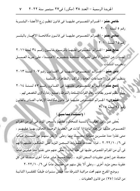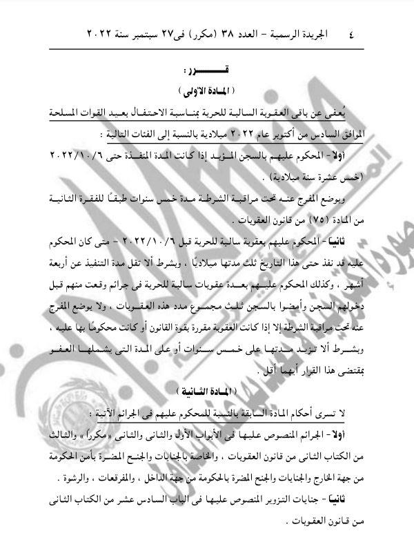 قرار جمهوري بالعفو عن بعض سجناء بمناسبة نصر أكتوبر