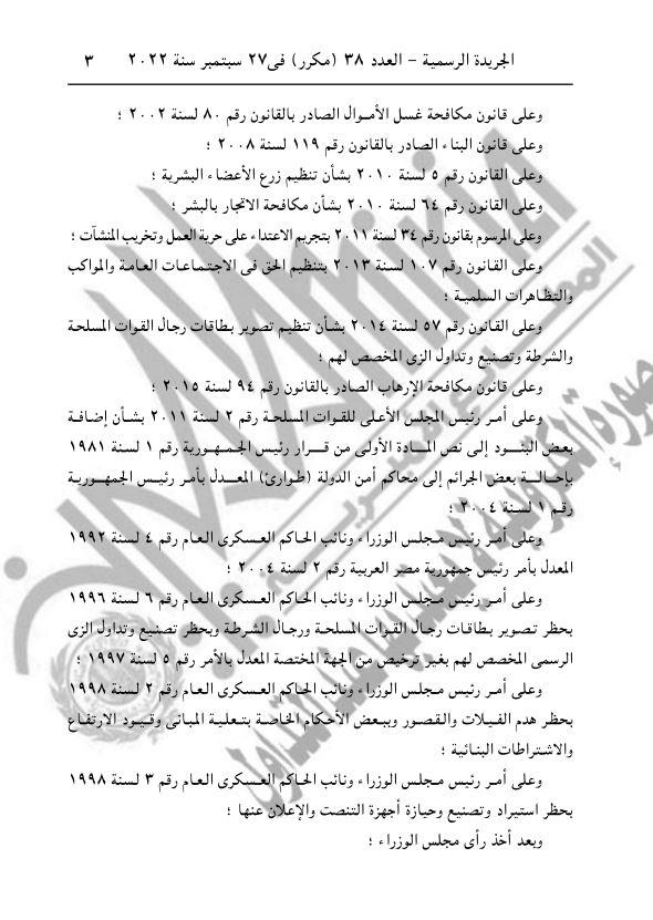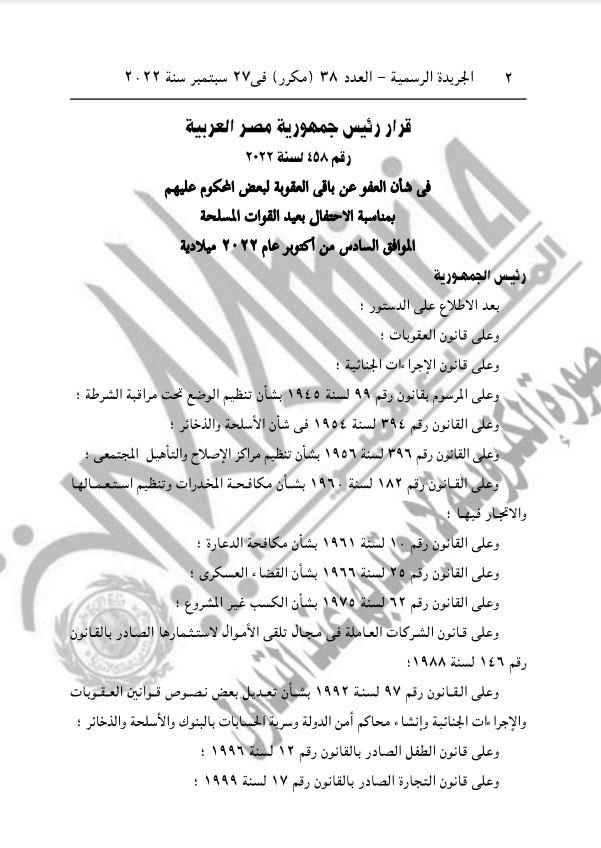 أصدر الرئيس عبد الفتاح السيسي قرار جمهوري رقم 458 لسنة 2022، في شأن العفو عن باقي العقوبة لبعض المحكوم عليهم بمناسبة الاحتفال بعيد القوات المسلحة الموافق السادس من أكتوبر عام 2022 ميلادية.