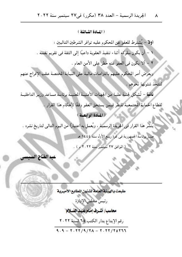 وفي وقت سابق، أعلنت لجنة العفو الرئاسي، الإفراج عن 39 من المحبوسين احتياطيا، ضمن سلسلة من الإفراجات عن بعض المساجين أو المحبوسين احتياطيًا خلال الفترة الأخيرة.