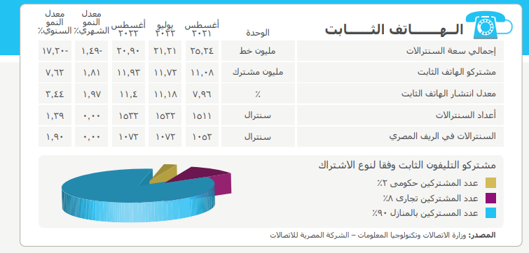 ولفت التقريرإلى أن عدد مشتركي الهاتف الثابت في مصر سجل نحو 11.93 مليون مشترك بنهاية شهر أغسطس 2022، مقارنة بنحو 11.08 مليون مشترك عن نفس الفترة عام 2021، بزيادة قدرها 850 ألف مشترك بمعدل نمو سنوي 7.62%، وشهري 1.81%، بعد أن سجل نحو 11.72 مليون مشترك في يوليو السابق عليه بزيادة قدرها 210 الف مشترك جديد