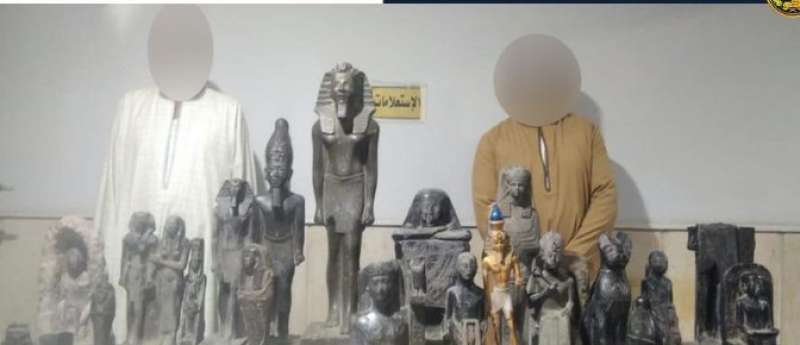عقب تقنين الإجراءات تم إستهدافهما وأمكن ضبطهما وبحوزتهما (عدد ٢٧ تمثال مختلف الأشكال والأحجام يشتبه فى أثريتهم - قطعتين من أجزاء تماثيل - كمية كبيرة من العملات المعدنية المقلدة وزنت حوالى ٢٠ كيلو جرام- دراجة نارية "بدون لوحات معدنية"- هاتفى محمول).