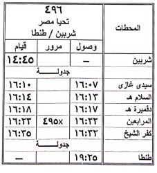 7 - تعديل ميعاد قطار 496 ركاب شربين / طنطا حيث يقوم من محطة شربين الساعة 14:45 ويصل محطة طنطا الساعة 19:25 كالجدول المرفق .