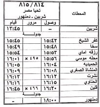1 – تعديل ميعاد قطار 814 / 815 ركاب شربين / دمنهور حيث يقوم من محطة شربين الساعة 13:45 يصل محطة دمنهور الساعة 18:00 كالجدول المرفق.