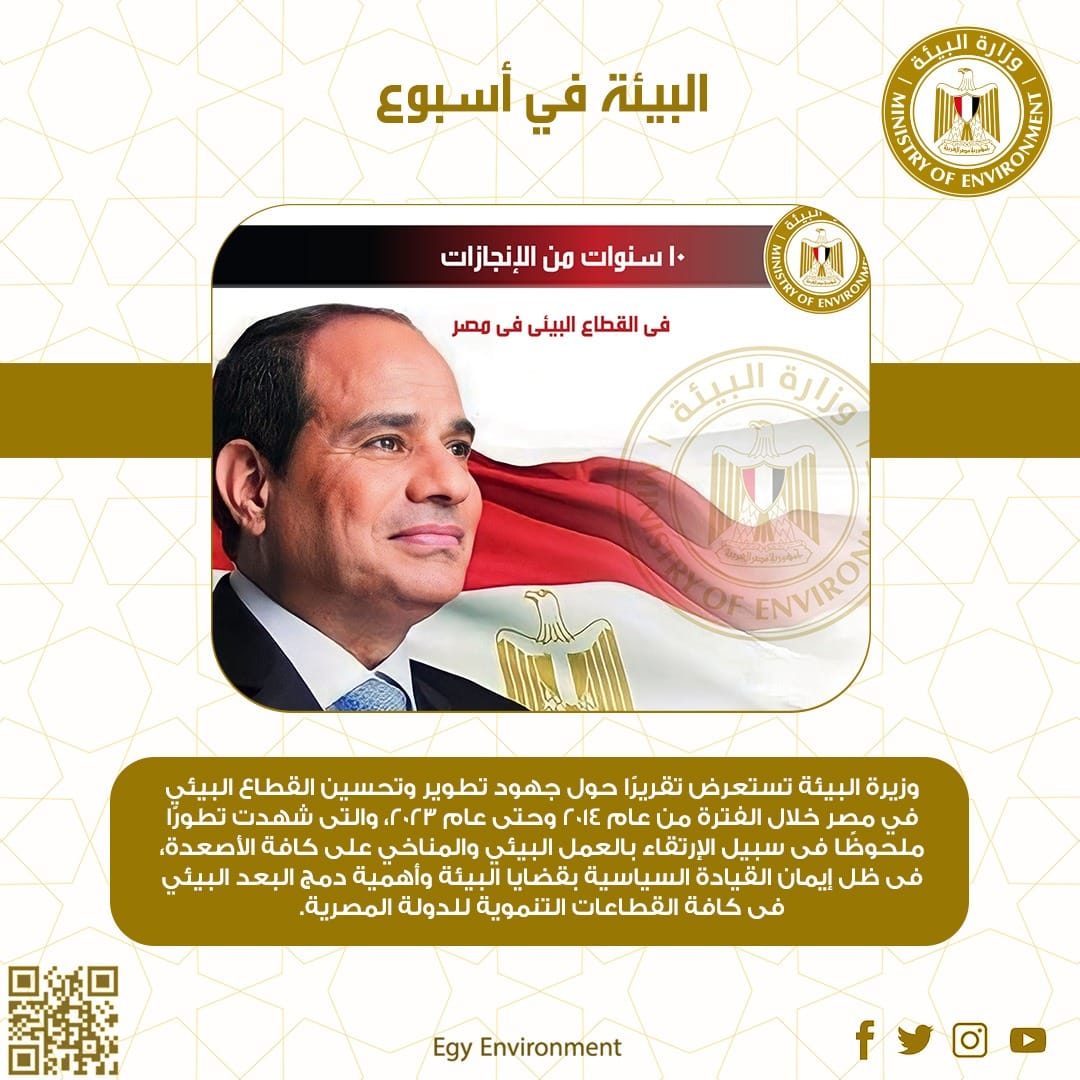 - الدكتورة ياسمين فؤاد وزيرة البيئة، تستعرض تقريرًا حول جهود تطوير وتحسين القطاع البيئي في مصر خلال الفترة من عام 2014 وحتى عام 2023، والتى شهدت تطورًا ملحوظًا فى سبيل الإرتقاء بالعمل البيئي والمناخي على كافة الأصعدة، فى ظل إيمان القيادة السياسية بقضايا البيئة وأهمية دمج البعد البيئي فى كافة القطاعات التنموية للدولة المصرية، وهو ما جعلها تخطو خطوات سريعة نحو تحقيق التنمية المستدامة وتعزيز فرص الإستثمار فى البيئة، ، وتشمل اهم إنجازات تلك الفترة: