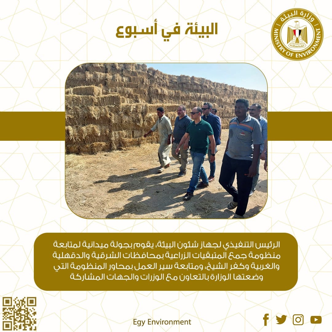 الدكتور علي أبوسنة، الرئيس التنفيذي لجهاز شئون البيئة، يقوم بجولة ميدانية لمتابعة منظومة جمع المتبقيات الزراعية بمحافظات الشرقية والدقهلية والغربية وكفر الشيخ، ومتابعة سير العمل بمحاور المنظومة التي وضعتها الوزارة بالتعاون مع الوزرات والجهات المشاركة، وذلك فى إطار تكليفات الدكتورة ياسمين فؤاد وزيرة البيئة بالمتابعة المستمرة والميدانية لأعمال منظومة مواجهة نوبات تلوث الهواء الحادة وأعمال جمع وكبس قش الأرز فى المحافظات المعنية بزراعة الأرز.