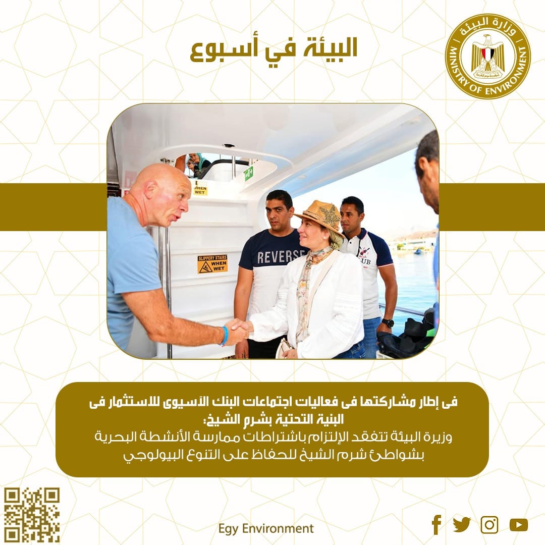 "وزيرة البيئة تشارك فى فعاليات اجتماعات البنك الآسيوى للاستثمار فى البنية التحتية بشرم الشيخ،وتتفقد الإلتزام باشتراطات ممارسة الأنشطة البحرية بشواطئ شرم الشيخ للحفاظ على التنوع البيولوجي"